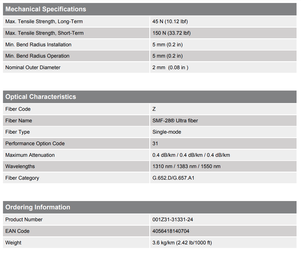 2.0 mm diameter, SMF-28® Ultra fiber, Single-mode (OS2)