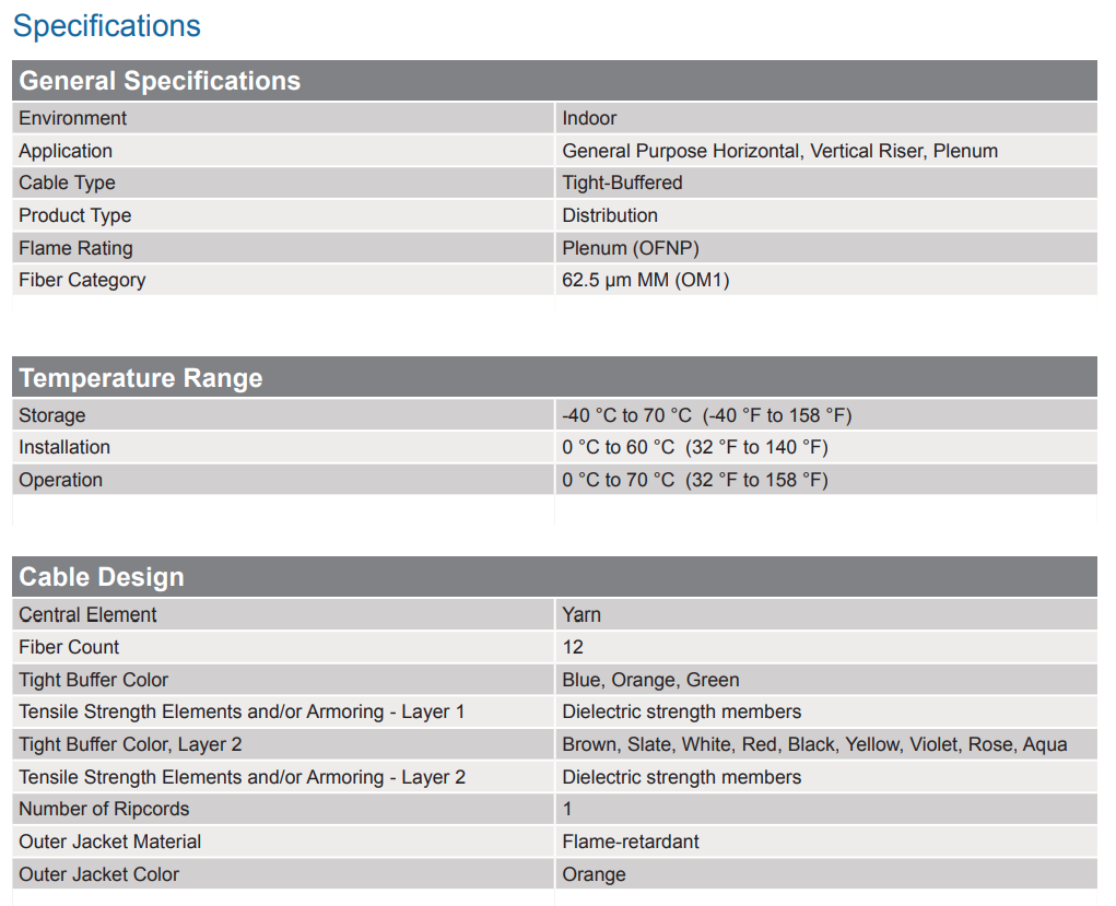 Corning Cable Systems MIC® Plenum Cables are designed for use in plenum, riser and general purpose environments for intrabuilding backbone and horizontal installations. These multifiber cables use 900 μm TBII® Buffered Fibers to allow easy, consistent stripping and to facilitate termination. The fibers are surrounded by dielectric strength members and protected by a flameretardant outer jacket.