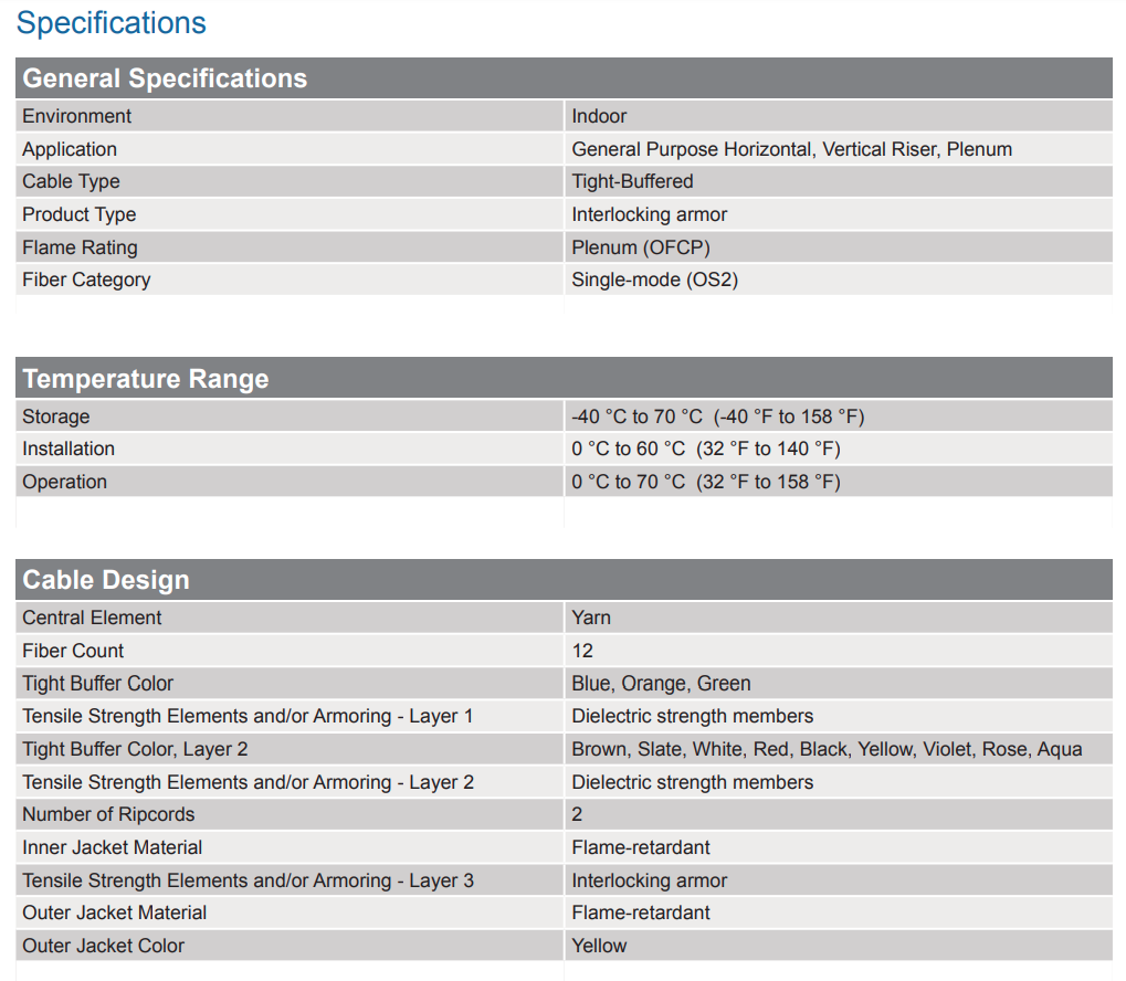 12-FIBER MIC® CABLE PLENUM SMF-28E+® INTERLOCKING ARMOR W/OUTER JKT
