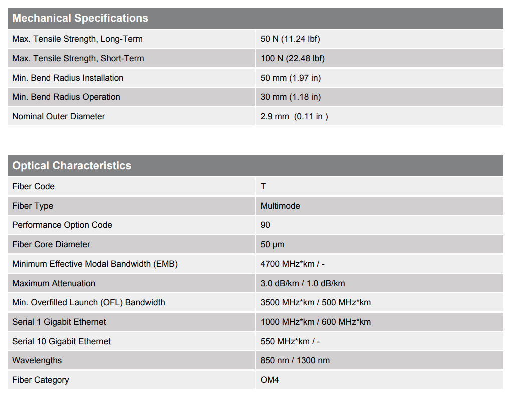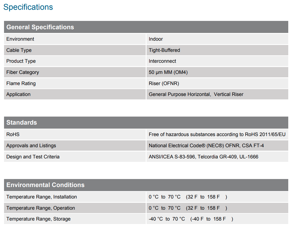 Corning DFX® cables have two 900 μm tight-buffered fibers surrounded by aramid yarn strength members in a flexible flame-retardant jacket. These cables meet the application requirements of the National Electrical Code (NEC) Article 770 and are OFNR and FT-4 listed. DFX cables are ideal for interconnect applications.