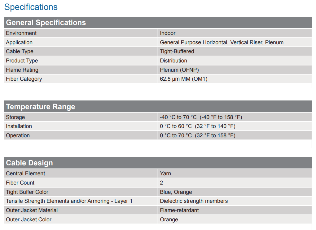 Corning Cable Systems MIC® Plenum Cables are designed for use in plenum, riser and general purpose environments for intrabuilding backbone and horizontal installations. These multifiber cables use 900 μm TBII® Buffered Fibers to allow easy, consistent stripping and to facilitate termination. The fibers are surrounded by dielectric strength members and protected by a flame-retardant outer jacket.