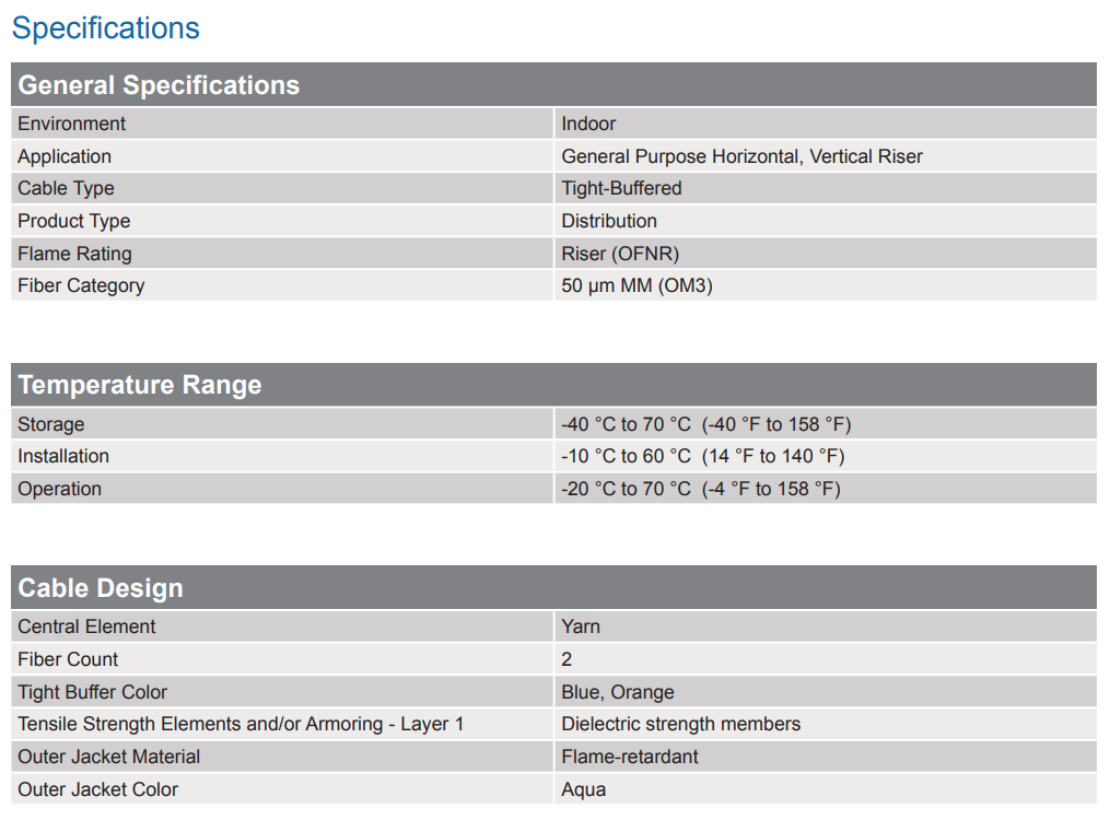 The all -dielectric cable construction requires no grounding or bonding, making these cables ideal for routing inside buildings including riser shafts, to the telecommunications rooms and workstations. The MIC Riser Cables meet the application requirements of the National Electrical Code® (NEC®) Article 770 and the ICEA S - 83 -596 test criteria. They are OFNR and FT -4 listed for riser and general -purpose use.