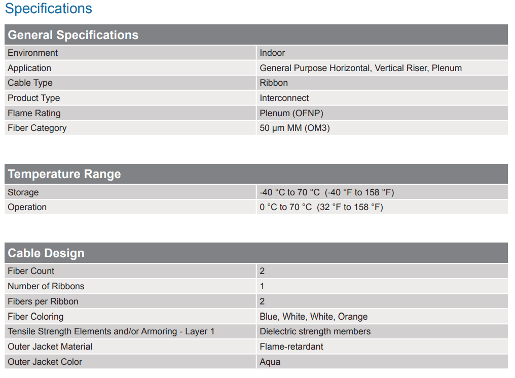 Corning ribbon plenum interconnect cables are designed for multifiber connector interconnect applications from equipment to patch panel or as a patch cord. Available with two, four, eight or 12 fibers, these cables make compact, rugged patch cables and offer a perfect complement to multifiber connector strategies. Dielectric strength members offer mechanical durability within a flexible, flame-listed. Retardant jacket. The cables meet application requirements of the National Electrical Code (NEC) Article 770 and are also OFNP and FT-6.