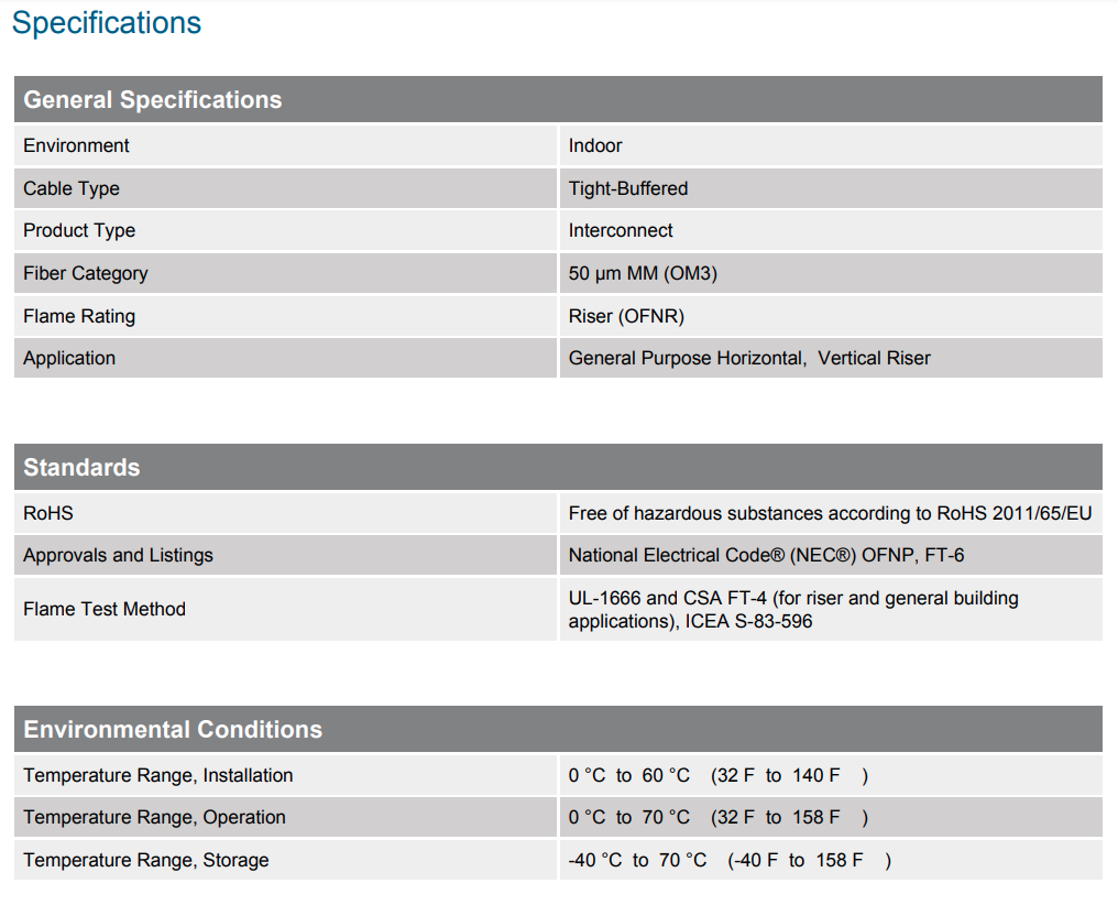 Corning zipcord cables are designed for interconnect applications, with two 900-μm buffered fibers surrounded by aramid yarn strength members and a flame-retardant jacket. This cable offers mechanical durability and flame resistance that meet the National Electric Code® (NEC®) Article 770 requirements.