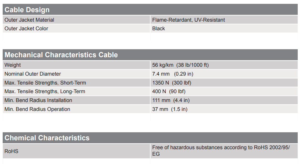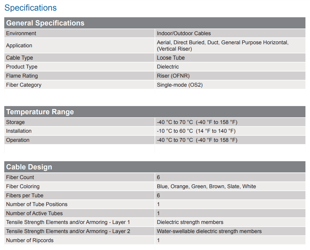 The SZ-stranded, loose tube design isolates fibers from installation and environmental rigors and allows for easy midspan access. The cable design is also National Electrical Code® (NEC®) listed (OFNR and FT-4). The all-dielectric cable construction requires no grounding or bonding and the UV-resistant, flame-retardant jacket is rugged, durable and easy to strip.