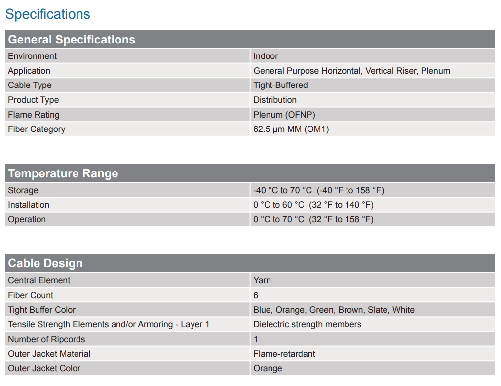 Corning Cable Systems MIC® Plenum Cables are designed for use in plenum, riser and general purpose environments for intrabuilding backbone and horizontal installations. These multifiber cables use 900 μm TBII® Buffered Fibers to allow easy, consistent stripping and to facilitate termination. The fibers are surrounded by dielectric strength members and protected by a flame-retardant outer jacket.