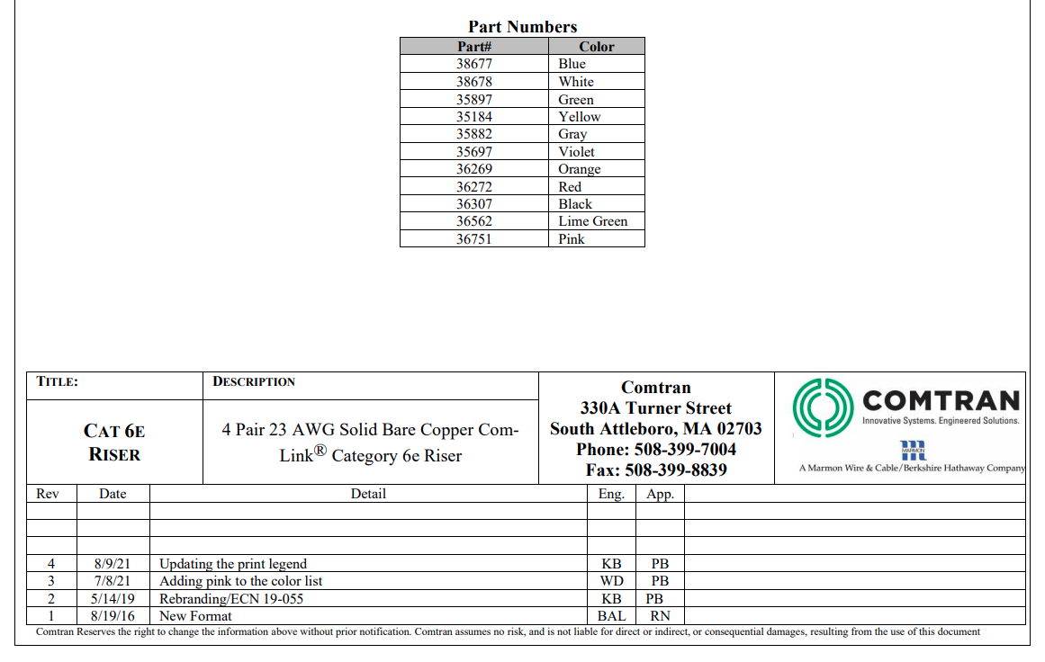 Comtran 35897 COM-Link Category 6e UTP Green Riser 1000 Ft. Box