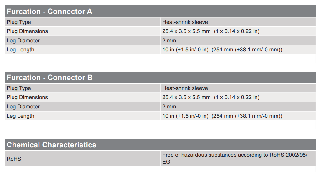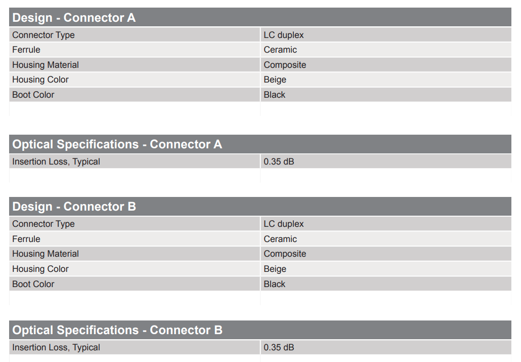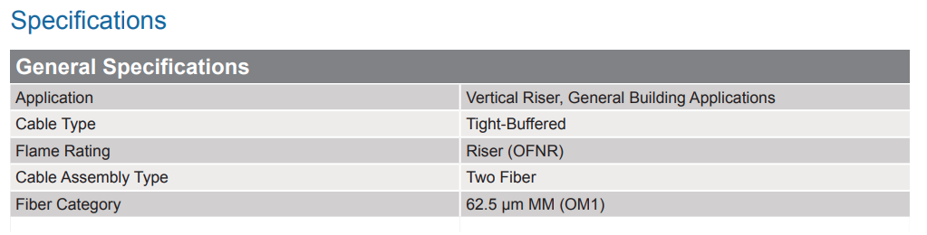 Two-fiber cable assemblies are offered with a variety of connector and cable combinations. Connector options include LC, SC, FC, ST® Compatible, and MT-RJ. RoHS compliant Zipcord, DFX®, MIC®, Fanout, and RIC cables are available.