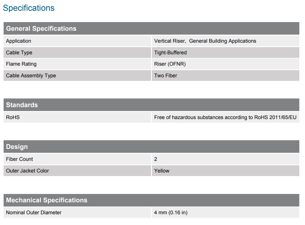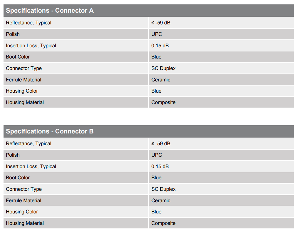 Two-fiber cable assemblies are offered with a variety of connector and cable combinations. Connector options include LC, SC, FC, ST® compatible, and MT-RJ. RoHS compliant Zipcord, DFX®, MIC®, Fan-out, and RIC cables are available.
